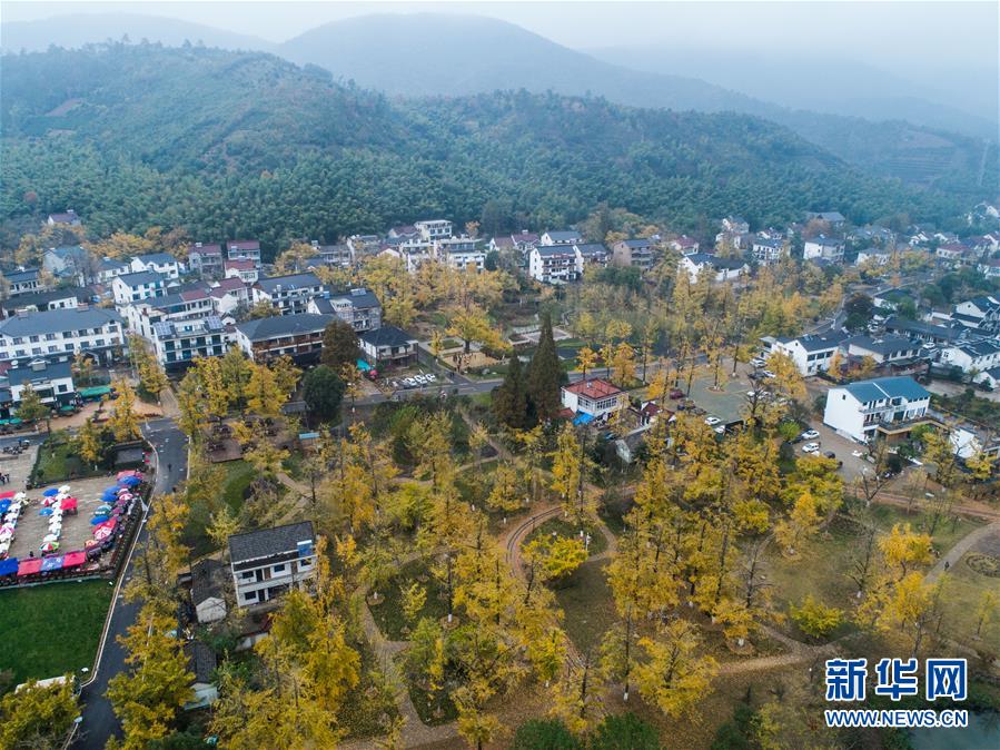 空中俯瞰十里银杏林长廊(11月16日无人机拍摄)。近日,在浙江省长兴县小浦镇,“十里银杏长廊”和近千亩花海经过近一年的升级改造后,以崭新的面貌与游客见面。花海、观光小火车、古村民宿、银杏长廊等旅游项目全面提升了小浦镇乡村旅游的品质。新华社记者 徐昱 摄