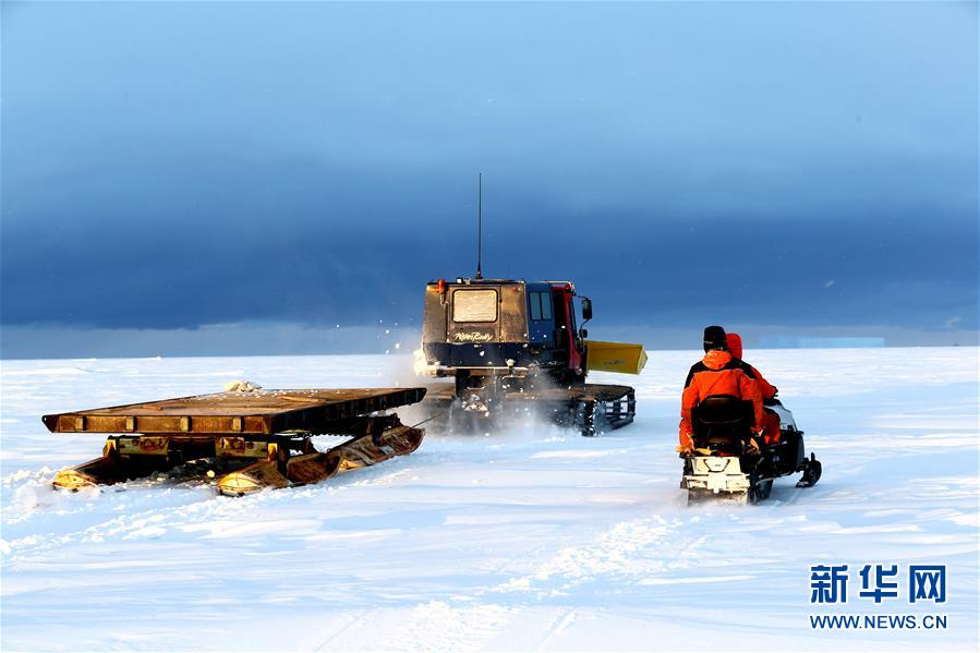 修路小组成员用雪地车装备的铲斗推平积雪(12月1日摄)。 搭载中国第35次南极科考队的“雪龙”号极地考察船日前到达距离中山站44公里处的陆缘冰区,准备迎来本次南极科考首场攻坚战——物资卸运。一支探冰小组随即展开海冰探路,以期尽快打通从“雪龙”号到中山站的冰上运输线,尽早启动冰上运货。 新华社记者 刘诗平 摄