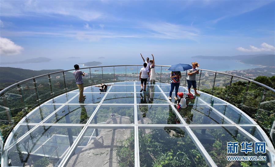 8月31日,游客在玻璃观景平台上参观游览。近日,位于海南省三亚市亚龙湾热带天堂森林公园的大佛石全海景玻璃栈道开始正式营业。凌空而建的玻璃栈道全长400米,游客可将亚龙湾的美景尽收眼底。新华社记者郭程摄
