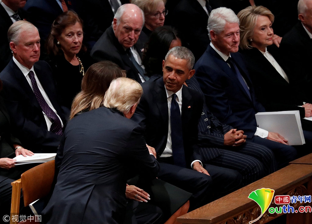 当地时间2018年12月5日,美国华盛顿,美国国家大教堂举行第41任总统老布什葬礼,美国现任和前任总统出席仪式,特朗普全程和克林顿夫妇无交流,仅与奥巴马握了手。据美媒揭露,特朗普自2017年1月上任以来,从未与奥巴马或克林顿夫妇交谈。