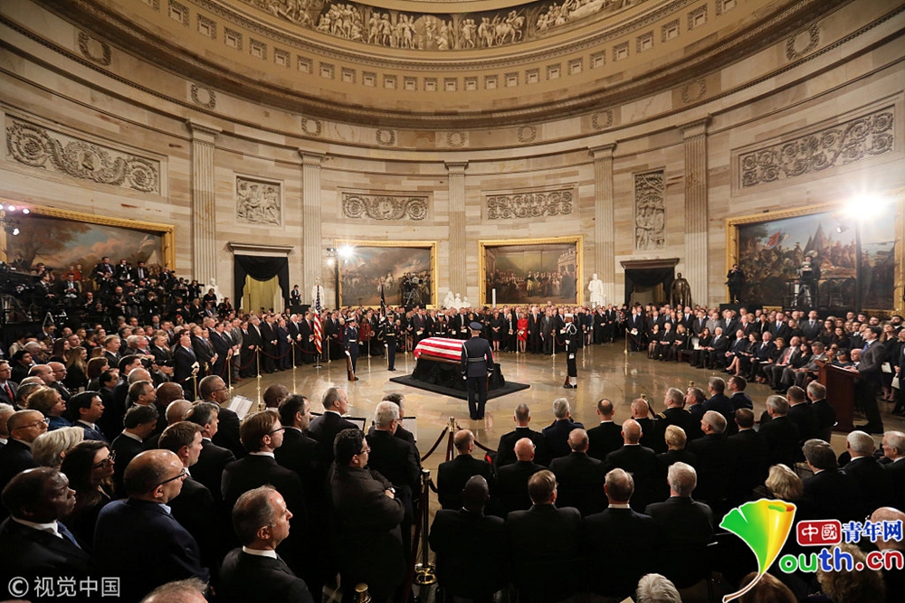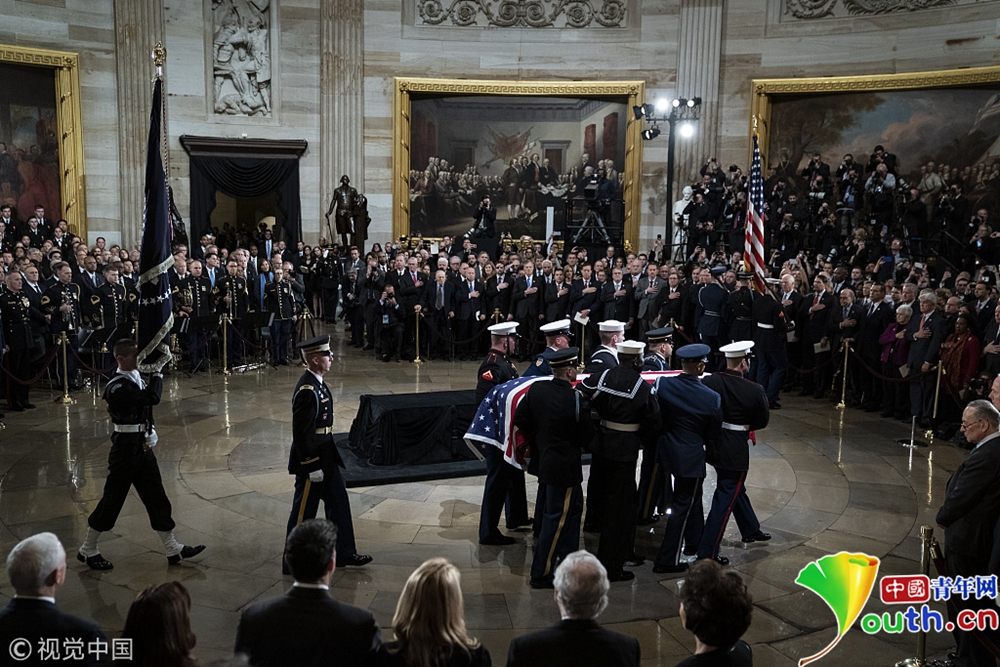 当地时间2018年12月3日,美国前总统老布什的灵柩送抵美国国会大厦,正式的追悼仪式就此开始。