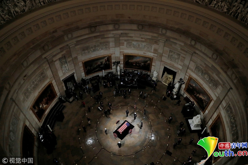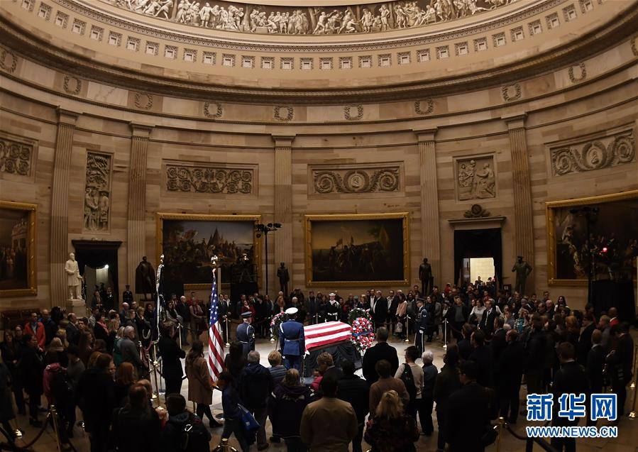 美国前总统老布什的遗体3日下午运抵首都华盛顿,安放在国会大厦圆顶大厅,接受吊唁。