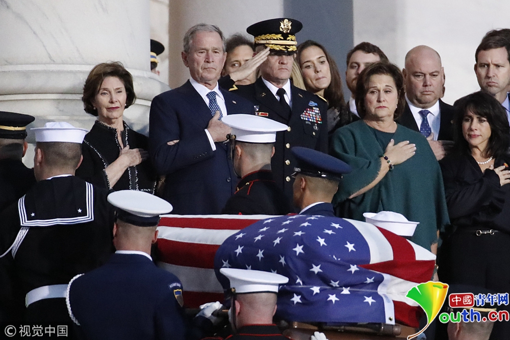 老布什灵柩安放在国会圆形大厅 小布什出席仪式