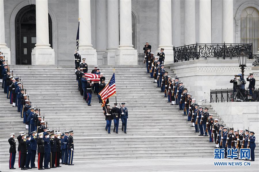 12月3日,在美国首都华盛顿,美国前总统乔治·赫伯特·沃克·布什(老布什)的灵柩抵达国会大厦。