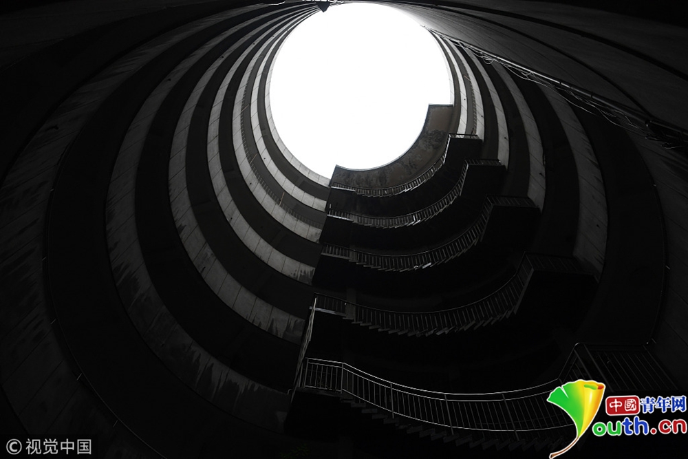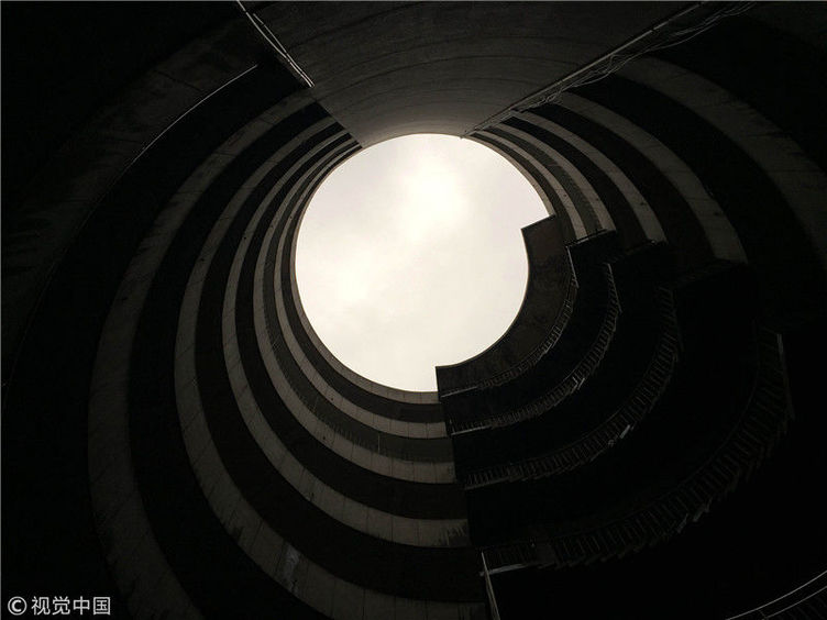 2017年9月27日,重庆,南岸区某小区的“螺旋”停车场,从公路到车库要下5层楼,司机需要转无数个360度圈。图片来源:视觉中国