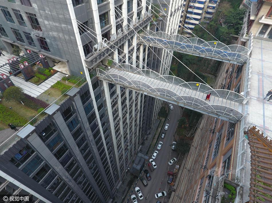 2017年3月16日,重庆,渝中区一栋大楼从22层架起两座平行的天桥,连接对面的魁星楼广场地面。图片来源:视觉中国 |