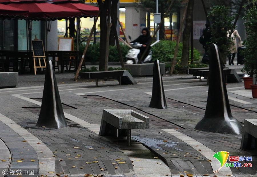 对于这种设计,不少市民觉得比较精巧的,远远地望去,就好像在海面上露出鱼鳍的一群鲨鱼,不仅可以防止被车辆占道,而且还有点装饰的效果。