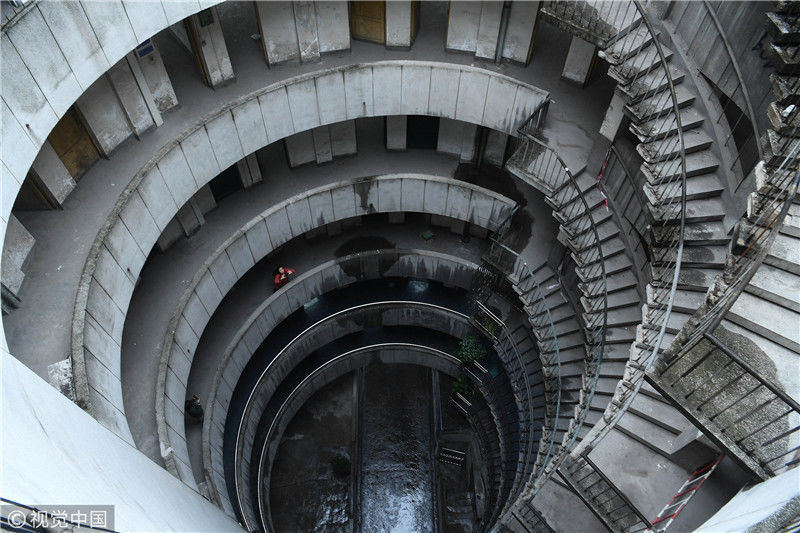 魔幻重庆再添新景观 公交车穿8层空心圆筒楼