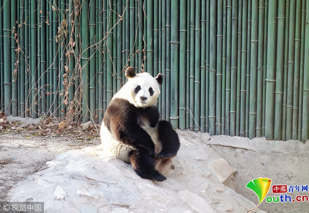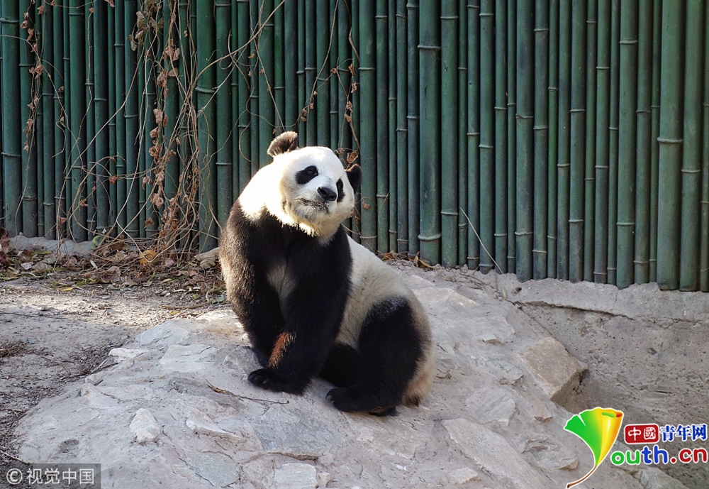 2018年12月8日,北京,大风过后,冬日暖阳,北京动物园大熊猫“滚滚”手捧竹笋左右开弓吃的美,卖萌撒娇心情大好。