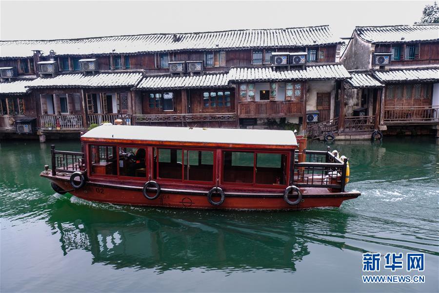 12月9日,游船行驶在乌镇景区的河道内。 受冷空气影响,浙江省桐乡市迎来大范围降雪,千年古镇乌镇被厚厚的白雪覆盖。小桥流水、白墙黑瓦的江南水乡古镇,呈现出冬日雪乡的独特韵味,吸引各地游客前来观赏。 新华社记者 徐昱 摄