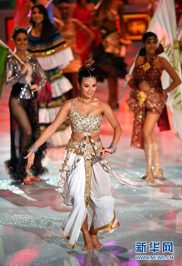 12月8日,佳丽们在进行开场舞表演。 当日,2018年第68届世界小姐全球总决赛在海南三亚举行,来自世界各地的118名佳丽参加比赛。 新华社记者 郭程 摄