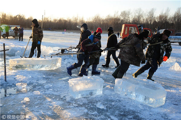 2018年12月8日,最低气温零下22度,哈尔滨市江北公路大桥东侧的江面上,工人们正在从江中捞取冰块,装车运往景区制作冰灯、冰雕。现场,工人先是用电锯、铁钎将冰分割成半米多宽,一米多长的冰块,接着将其拉出水面。等候在旁的叉车上前,将冰装上运冰的卡车,之后装满冰块的卡车驶往景区。