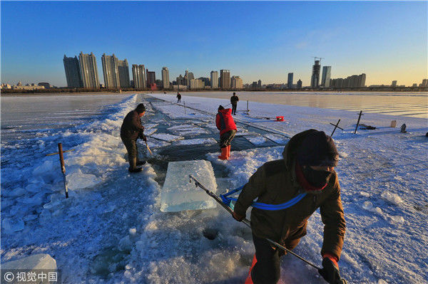 2018年12月08日,黑龙江省哈尔滨市,松花江采冰,今日正式出冰。本次采冰,是为第二十届哈尔滨冰雪大世界的建造而进行。