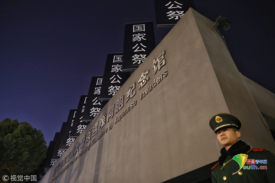 2018年12月12日晚,江苏南京,侵华日军南京大屠杀遇难同胞纪念馆沿线道路庄严肃穆、安保和工作人员做好了准备,迎接第五个南京大屠杀死难者国家公祭日。2018年是南京大屠杀惨案发生81周年,第五个南京大屠杀死难者国家公祭仪式将于12月13日举行。图片作者:尼克