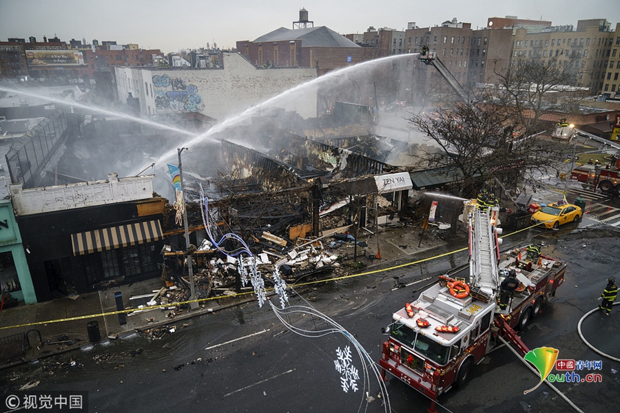 美国纽约发生大火吞噬六家商铺 消防员扑灭火灾余烬