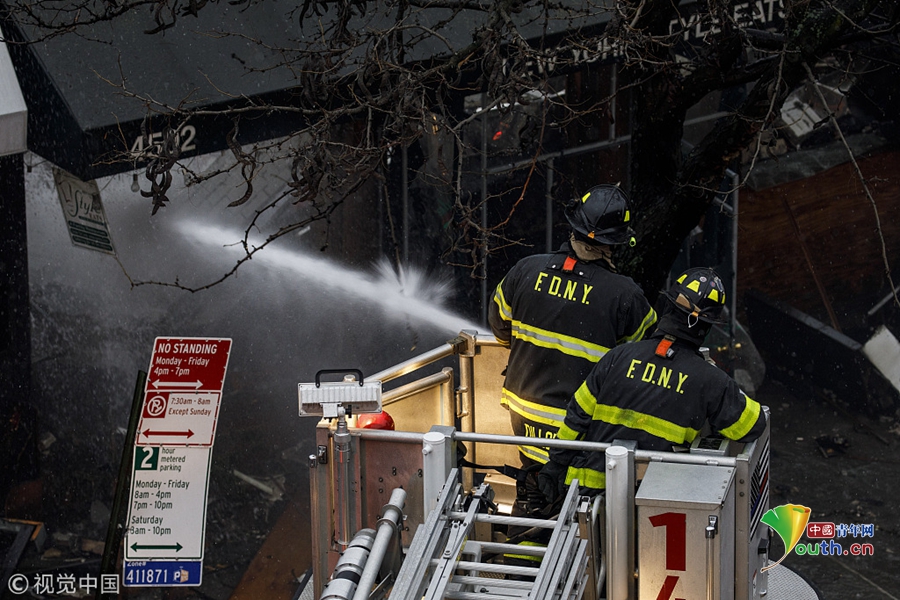美国纽约发生大火吞噬六家商铺 消防员扑灭火灾余烬