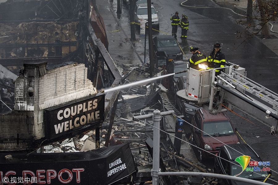 美国纽约发生大火吞噬六家商铺 消防员扑灭火灾余烬