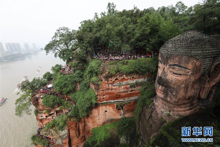 10月4日,游客在乐山大佛景区的栈道上有序排队,一睹大佛真容。 新华社记者 江宏景 摄