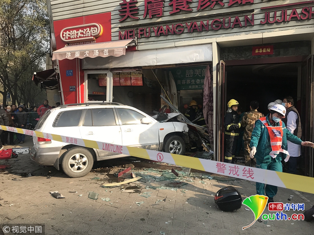 2018年12月14日上午10时左右,在郑州市中原区淮河路与工人路交叉口发生一起交通事故。一辆白色SUV轿车在撞上一辆电动自行车后冲入沿街一包子店,事故造成1人死亡,8人受伤。据郑州市交巡警二大队通报,目前,59岁的肇事司机陈某已被警方控制,伤者送医救治,事故正在进一步调查。图为交警在事发地点处理事故。