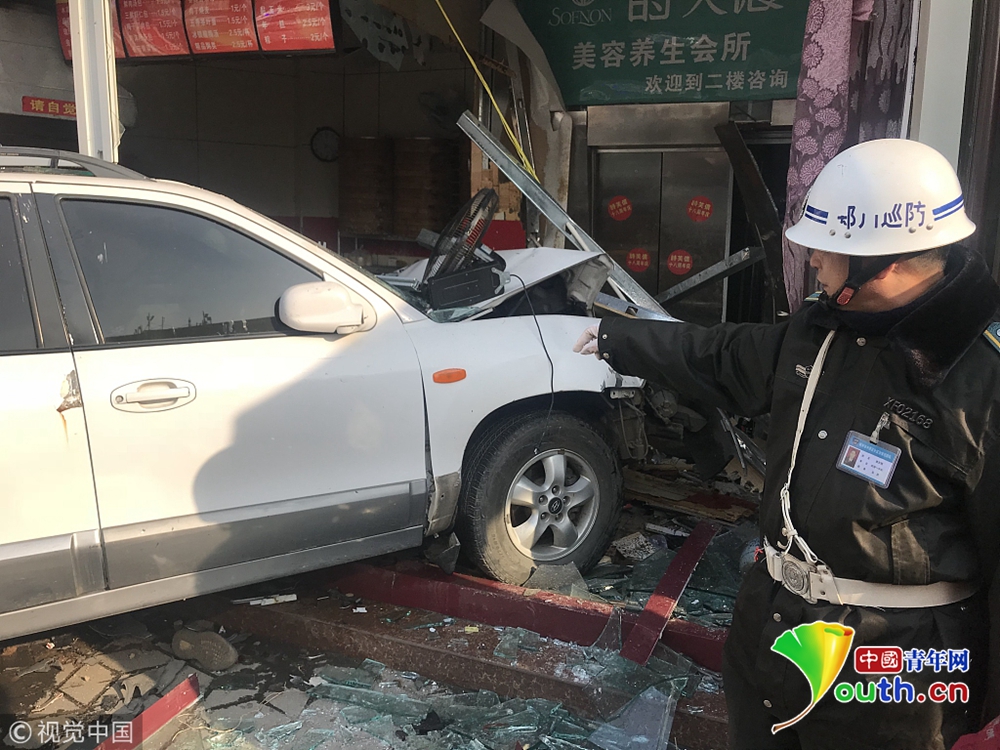 图为郑州街头,一辆白色汽车冲进沿街店铺。