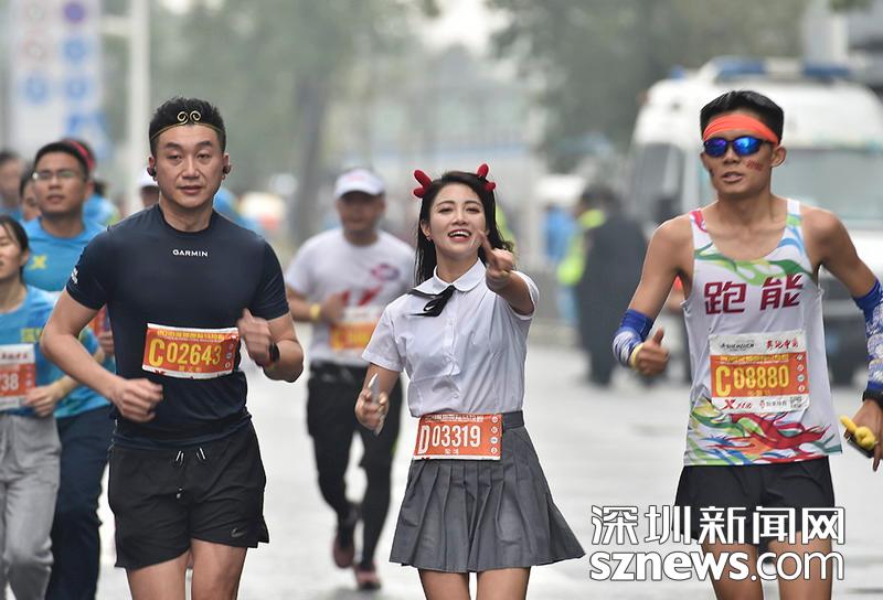 2018年12月16日,深圳国际马拉松位于后海的折返点,三名选手正在向终点冲刺,跟其他选手不同,其中两位选手选择了自己搭配服装参赛。