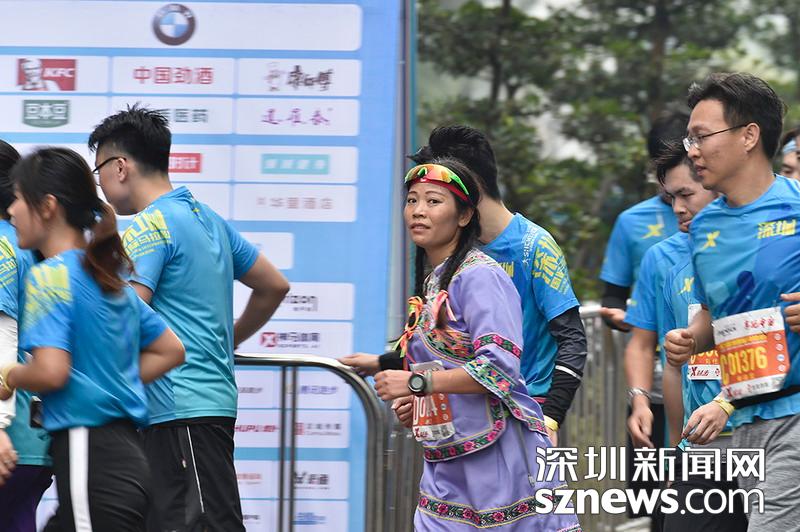 2018年12月16日,深圳国际马拉松位于后海的折返点,一名身着民族传统服装的选手正在向终点冲刺。