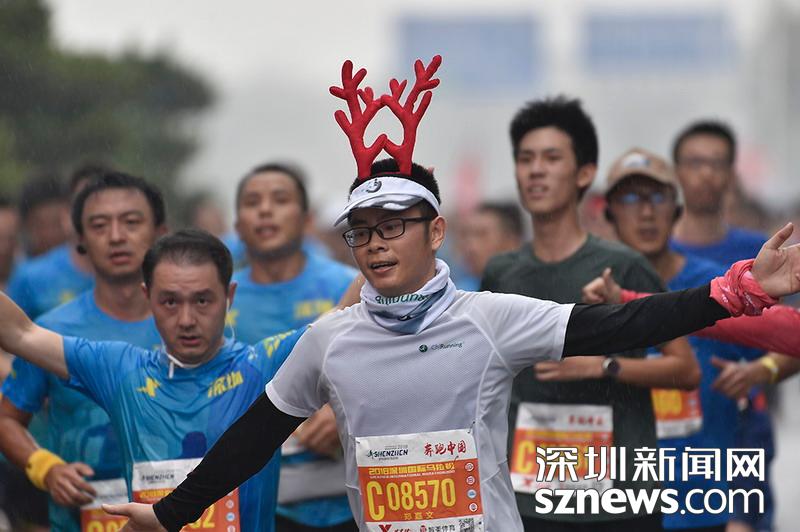 2018年12月16日,深圳国际马拉松位于后海的折返点,一名头戴圣诞鹿角头箍的选手正在向终点冲刺。