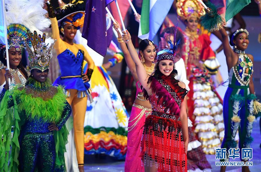 12月8日,佳丽们在进行开场舞表演。 当日,2018年第68届世界小姐全球总决赛在海南三亚举行,来自世界各地的118名佳丽参加比赛。 新华社记者 郭程 摄