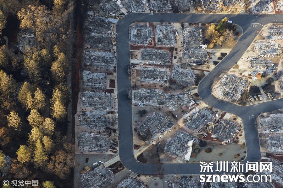当地时间2018年12月10日,美国加州,成千上万英亩的土地被野火烧毁,数百栋建筑变成灰烬。“坎普”大火是加州历史上最致命和破坏性最大的野火,导致88人死亡,超过18000座建筑被毁。