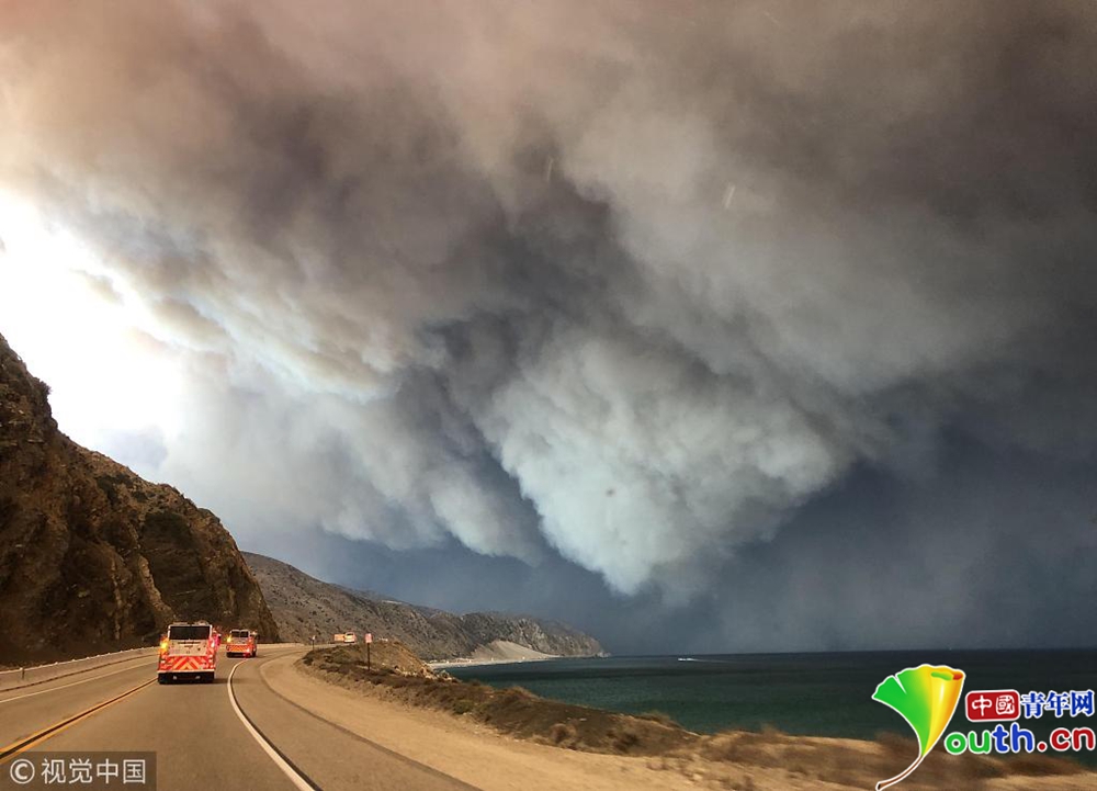 当地时间11月9日下午,美国加利福尼亚州南部文图拉郡(Ventura County)等地熊熊山火已延烧逾万英亩,浓烟遮天蔽日。