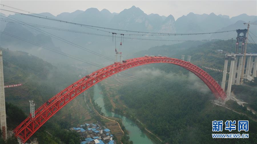 9月12日使用无人机拍摄的大小井特大桥。 目前,横跨在贵州省罗甸县大井河上的大小井特大桥建设进入冲刺阶段。大小井特大桥全长1.5公里,主跨450米,是世界最大跨径上承式钢管混凝土拱桥。据了解,该桥是平塘至罗甸高速公路关键性工程,对打通贵州“断头路”,助推滇黔桂石漠化片区脱贫攻坚具有重要意义。 新华社记者刘续摄