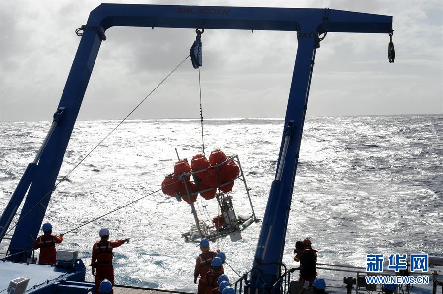 考察队员在“沈括”号上回收“彩虹鱼”着陆器(12月16日摄)。