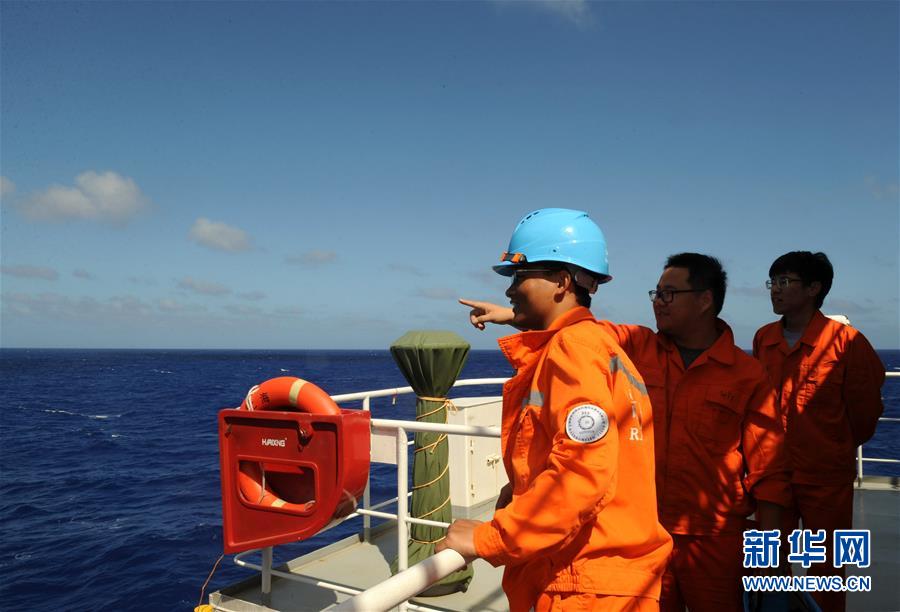 “彩虹鱼”科考团队队员搜寻浮出海面的着陆器(12月15日摄)。