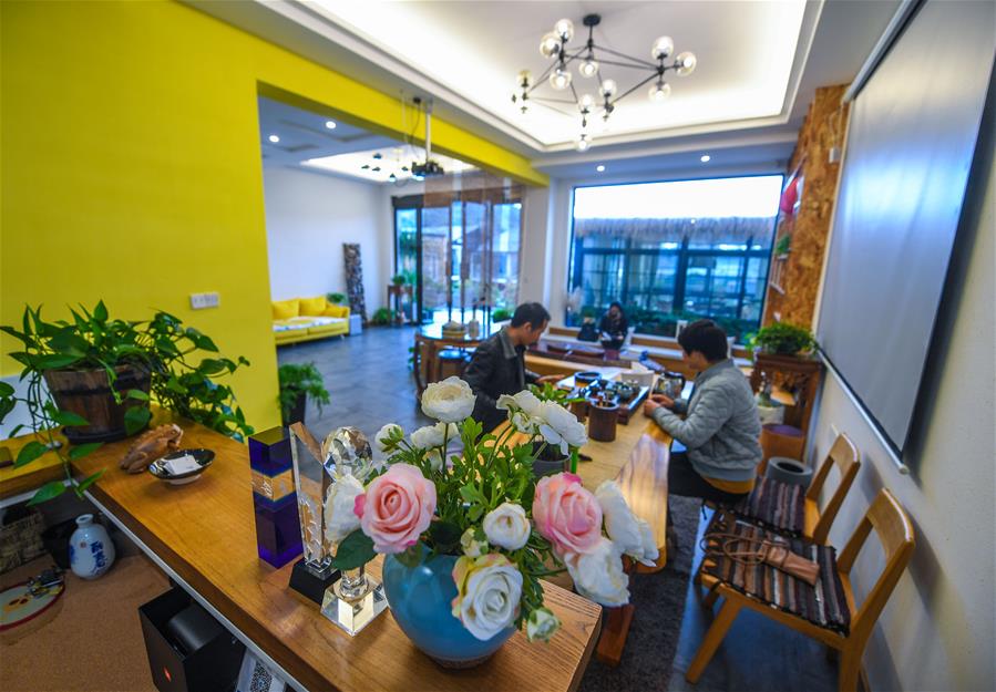 12月15日,客人在朱家尖乌石塘“渔夫客栈”民宿大厅喝茶。该民宿有海景房7间,餐饮包厢8个。 新华社记者 徐昱 摄