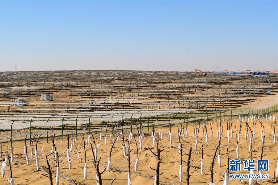 位于库布其沙漠腹地的达拉特光伏发电应用领跑基地一期500兆瓦项目(12月13日摄)。