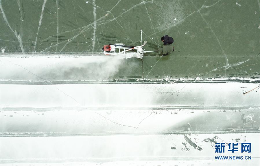 在松花江哈尔滨段江面,工人们在进行切割和采冰工作(12月12日无人机拍摄)。 黑龙江哈尔滨市的冰雪主题乐园哈尔滨冰雪大世界的采冰和建设工作近日拉开帷幕。为保证足够的优质冰供给,每天有近千名采冰人和700多辆运冰车参与到采冰工作。 新华社记者 王松 摄