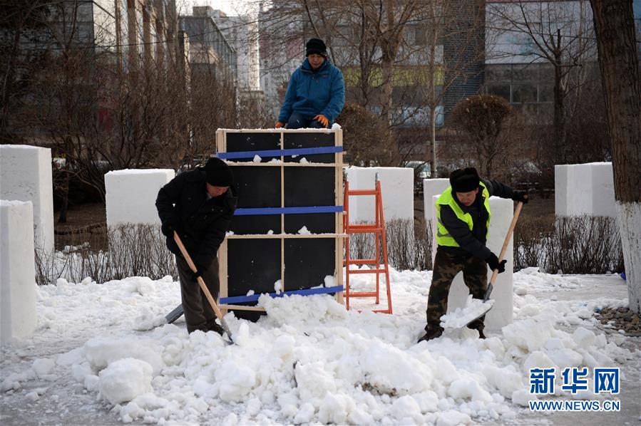12月17日,工人们在松花江畔收集雪块,准备制作雪雕作品。新华社记者王凯摄