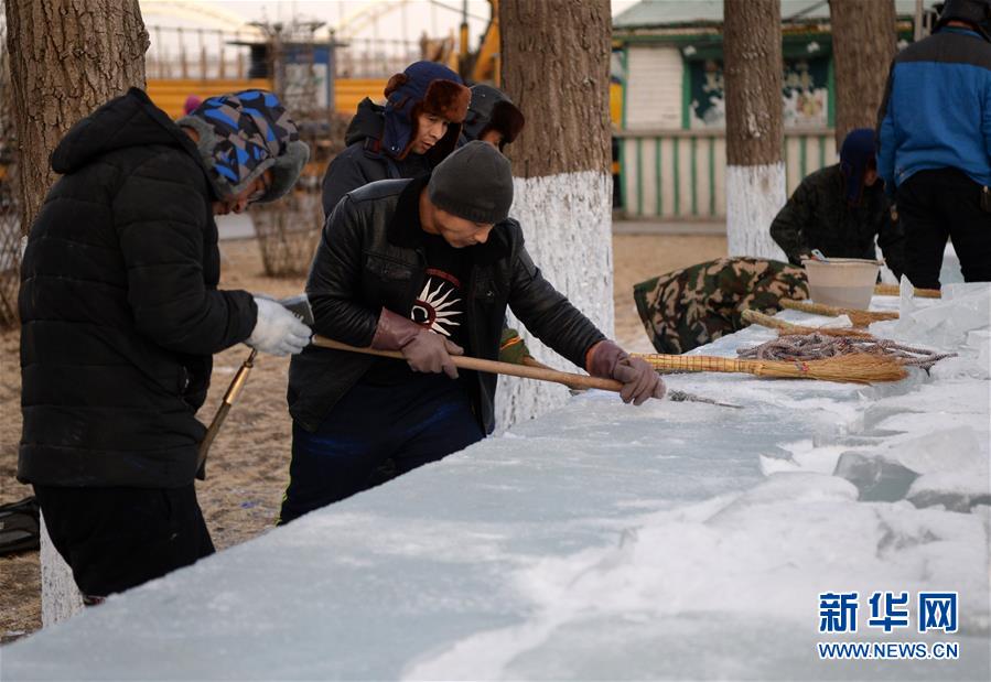 12月13日,工人在第二十届哈尔滨冰雪大世界园区施工。