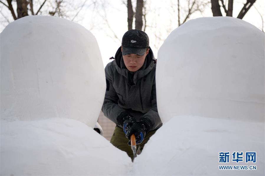 2018年12月13日,黑龙江省哈尔滨市,国内最大的雪雕盛会太阳岛雪博会正在紧锣密鼓建设中,部分雪雕雏形已现,雪雕师正在精雕细刻打磨中。