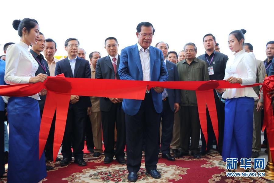 12月17日,柬埔寨首相洪森(中)在上丁省参加桑河二级水电站竣工投产仪式。