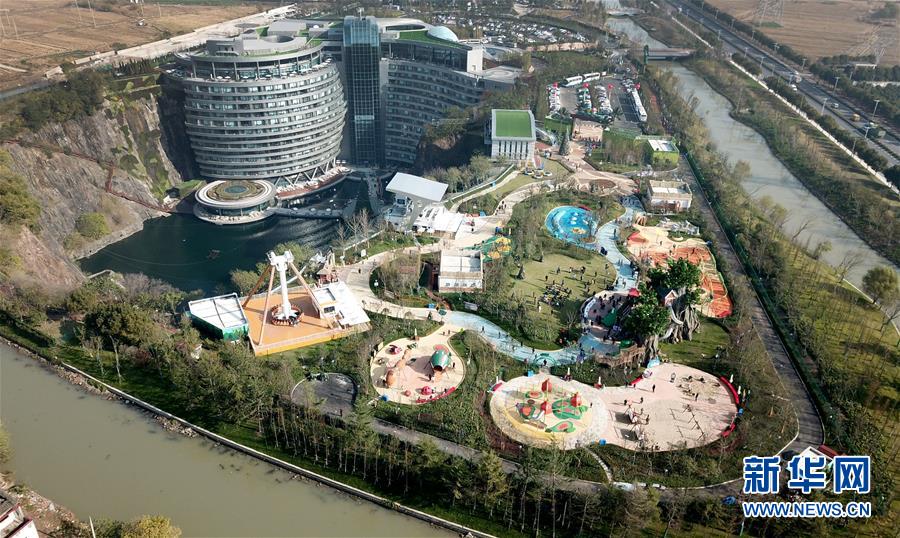 12月18日无人机拍摄的世茂精灵之城主题乐园。 当日,“世茂精灵之城主题乐园奇幻亲子嘉年华开幕暨上海公益基地揭牌仪式”在位于上海佘山国家旅游度假区的世茂精灵之城主题乐园一期(“深坑秘境”)正式启动。“深坑秘境”毗邻上海佘山世茂洲际酒店,除了拥有俯瞰“深坑”的玻璃栈道外,还包括360度崖壁大摆锤、精灵树屋、沙漠考古、梦幻水域和虫虫世界等项目,带来亲子游玩新体验。 新华社记者 方喆 摄