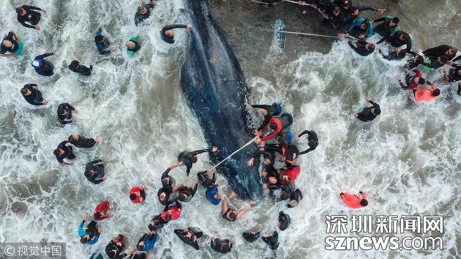 当地时间2018年4月9日,阿根廷马德普拉塔,一条鲸鱼在当地海滩搁浅,虽经民众合力救助仍最终死亡。