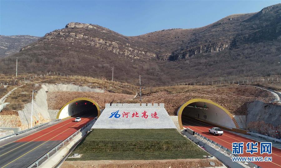 12月16日,两辆汽车行驶在京秦高速公路二期工程河北玉田境内的凤凰顶隧道路段(无人机拍摄)。 新华社记者杨世尧摄