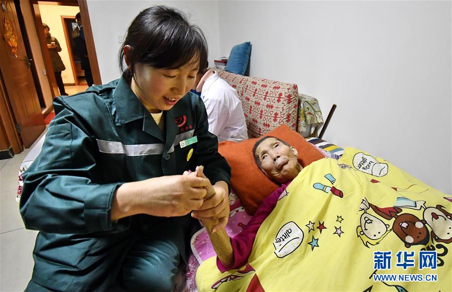 12月17日,丰台区太平桥街道温馨精康园员工在照顾失智失能的王秀珍老人,为她的家人提供短期“喘息服务”。