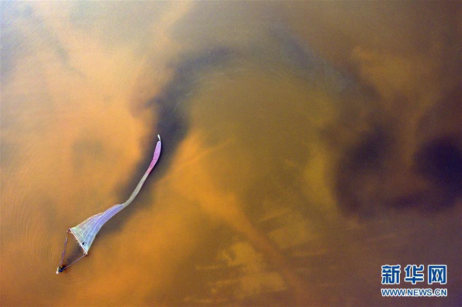 2018年7月6日,捕捞人员在山西运城盐湖内捕捞盐水虫。 大地之色,俯仰之间;壮美山河,是我的祖国。2018年,新华社记者操纵无人机“飞阅”华夏大地,在最美的时节,定格下她的色彩斑斓。 新华社记者 曹阳 摄