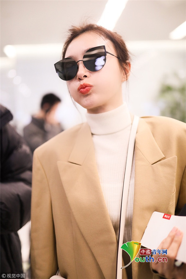 秦岚穿星星外套活力四射 架黑超涂红唇笑靥如花