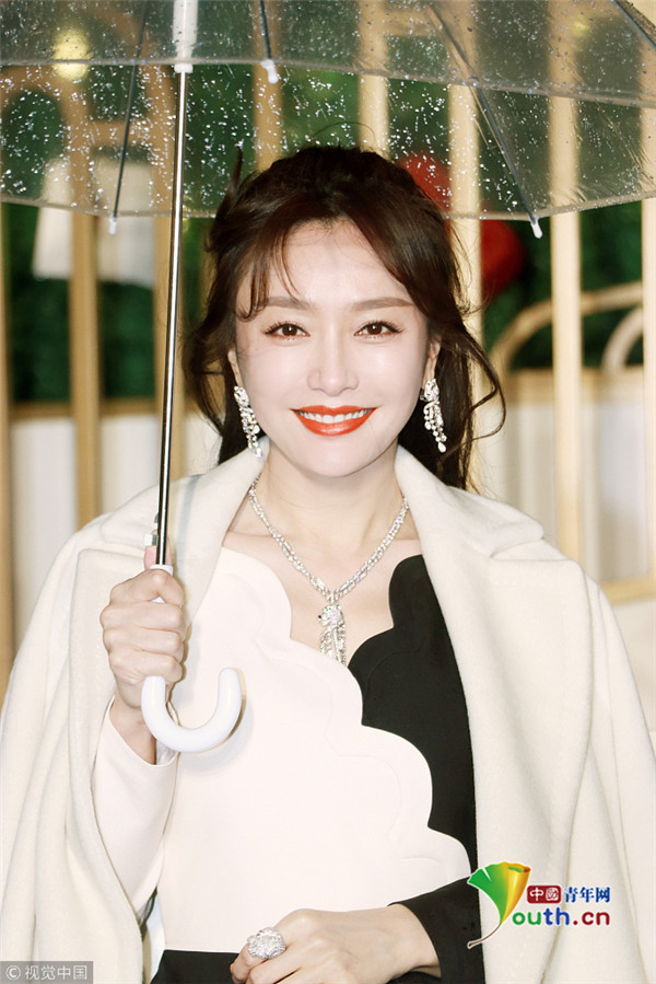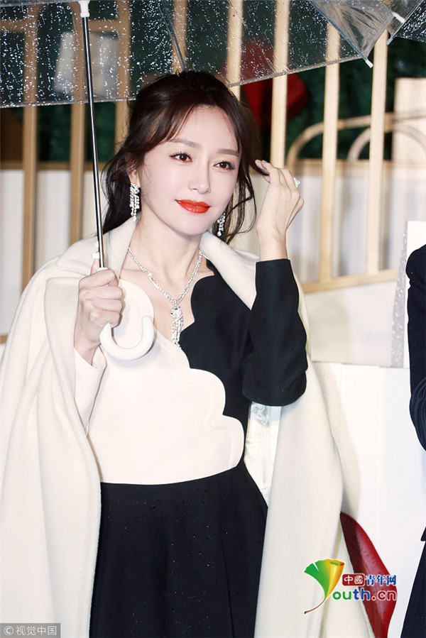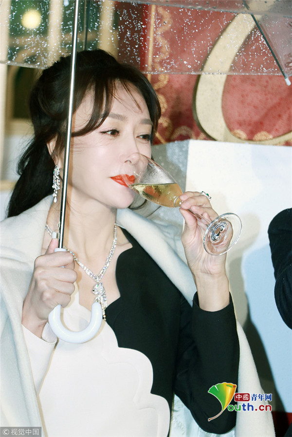 秦岚撑伞雪肤红唇美如画 优雅品香槟气质高贵迷人