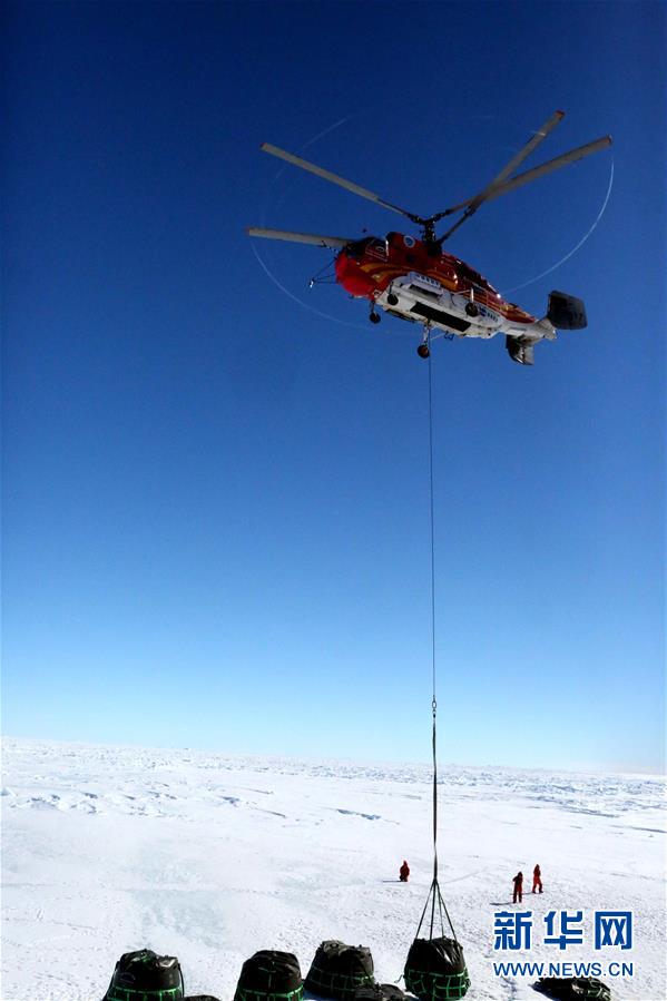 从11月30日开始,考察队成功将1605吨物资由“雪龙”号运至南极中山站和内陆考察出发基地,冰上运输和直升机吊运分别为951吨和654吨。