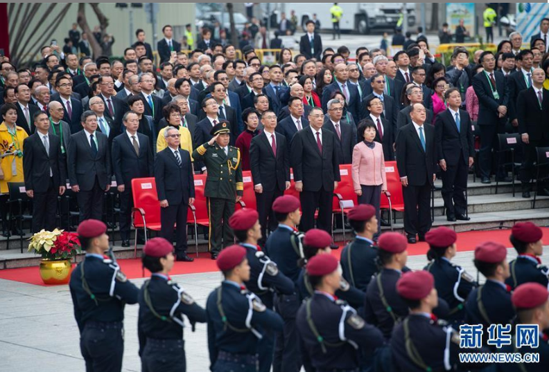 12月20日,澳门特区行政长官崔世安(前右三)、中央人民政府驻澳门联络办公室副主任姚坚(前左三)、外交部驻澳门特别行政区特派员公署特派员沈蓓莉(前右二)等出席升旗仪式。新华社记者 张金加 摄