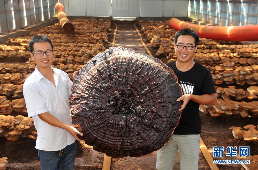 9月4日,韩子南(左)和韩子夜在展示他们培育出的直径达1米的巨型灵芝。